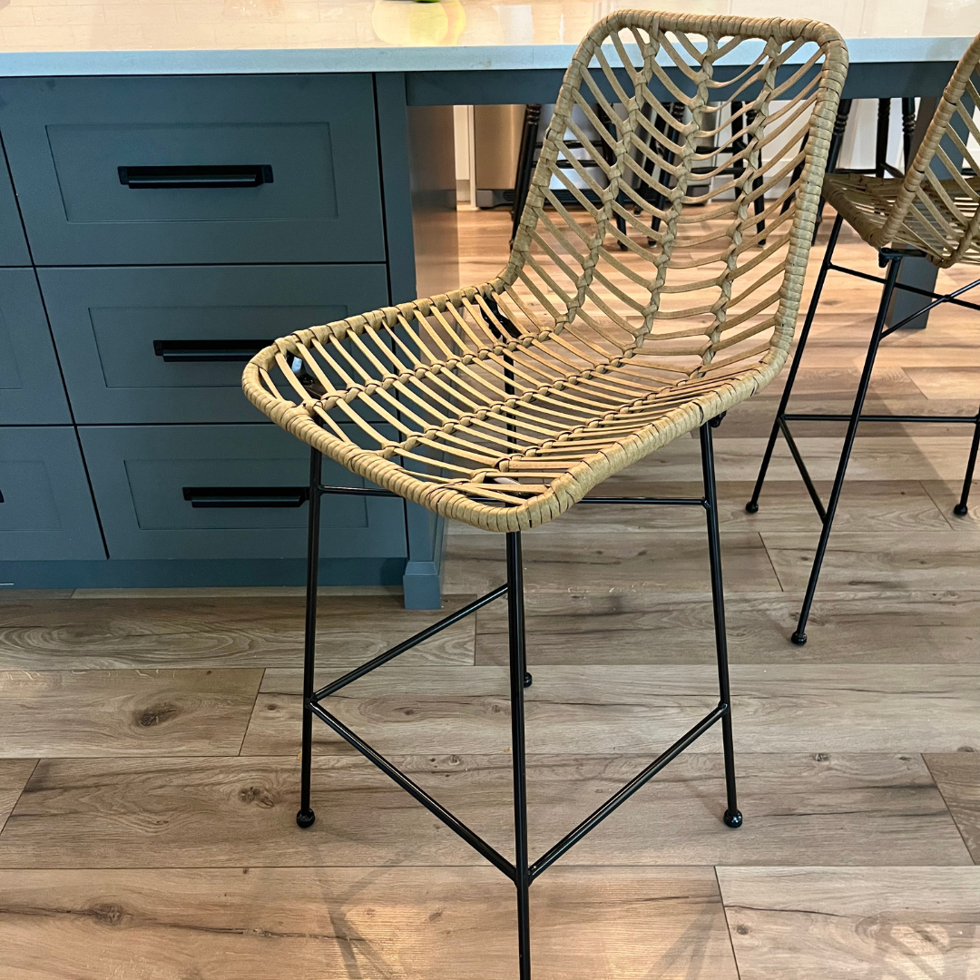 Our complimenting counter stool to our Rattan dining chair. This comfortable and durable counter chair can be used both inside and outside! It comes in two pieces, easy to bolt together, and adds a boho flair to your dining area. The base and legs are made from electrophoresis iron so they can withstand the outdoor elements if you choose to use for outdoor purposes.